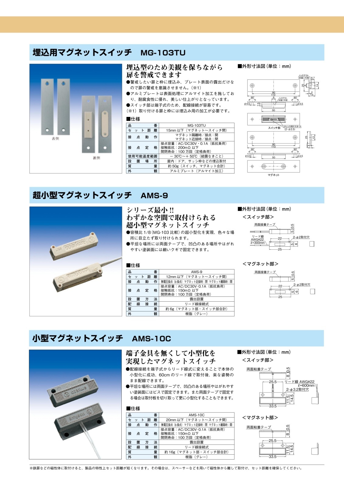 薄型設計・簡単取付!a接点仕様のマグネットスイッチ通常在庫品です。決済確認後すぐに発送致します。MG-103Sa(B)は、a接点仕様のマグネットスイッチで、a接点入力専用の機器(チャイムなど)に適した…