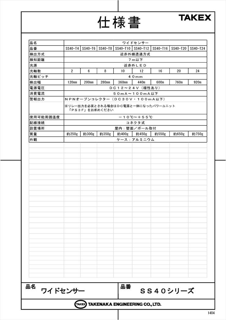 | 検出幅 | SS40-T4:120mm、SS40-T6:200mm、SS40-T8:280mm、SS40-T10:360mm、SS40-T12:440mm、SS40-T16:600mm 、SS40-T20:760mm、SS40-T24:920mm |