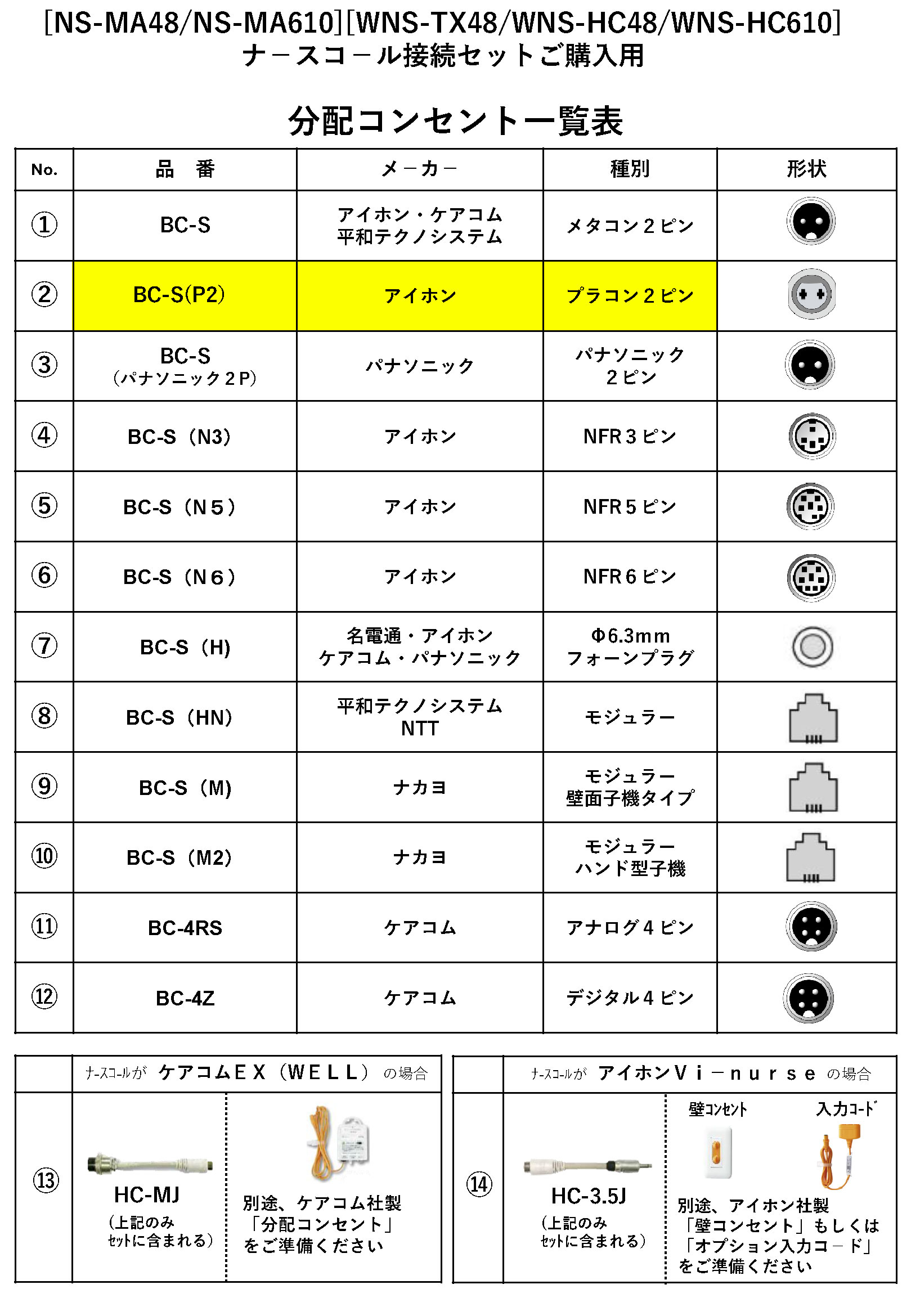 分配コンセントBC-S(P2)はアイホン製プラコン2ピン専用です。その他端子形状のシステムへ接続する場合は該当仕様の分配コンセントをご選択ください。