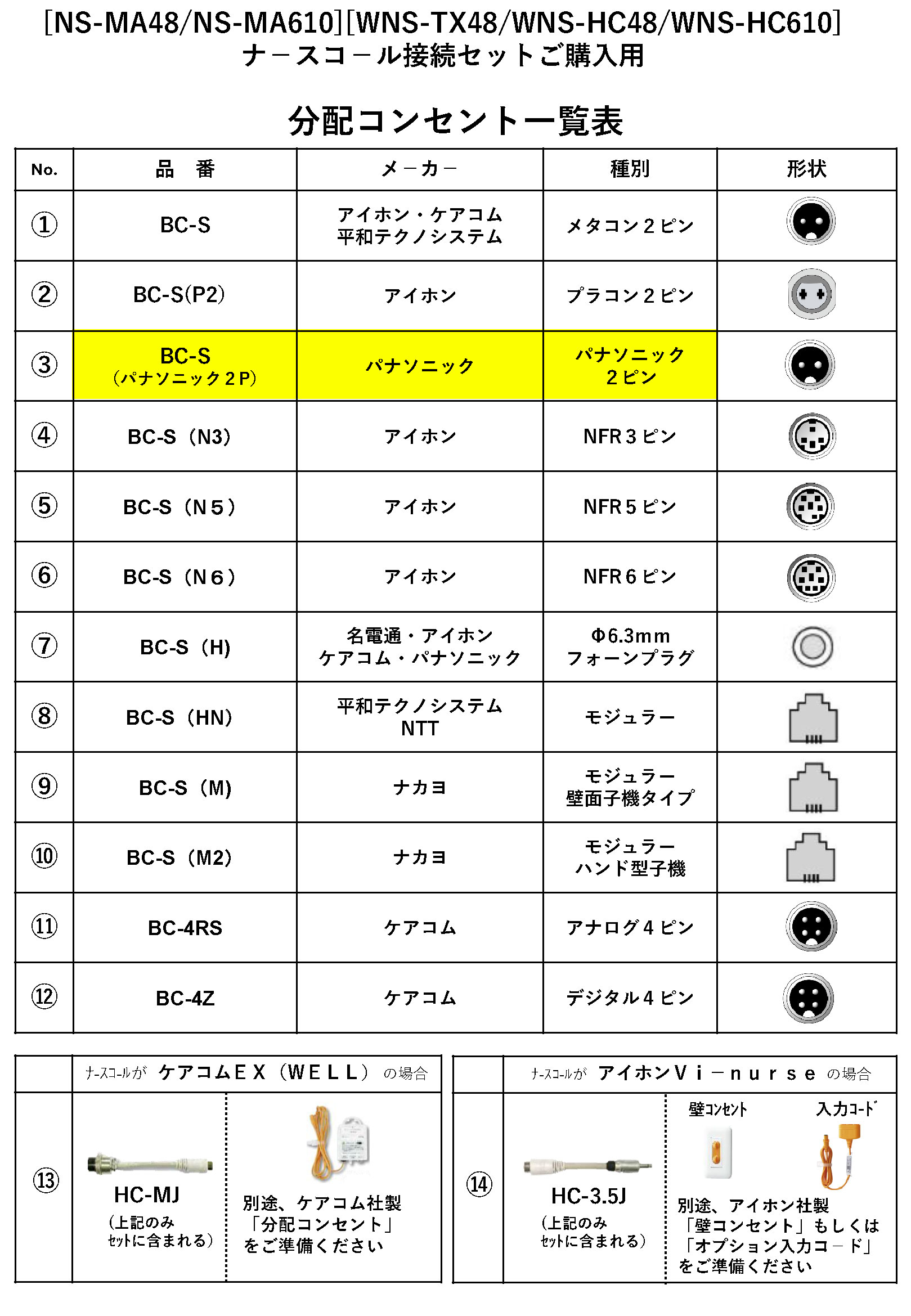 - 分配コンセント:パナソニック2ピン向け仕様(子機・握り押しボタンとセンサーの併用を想定)