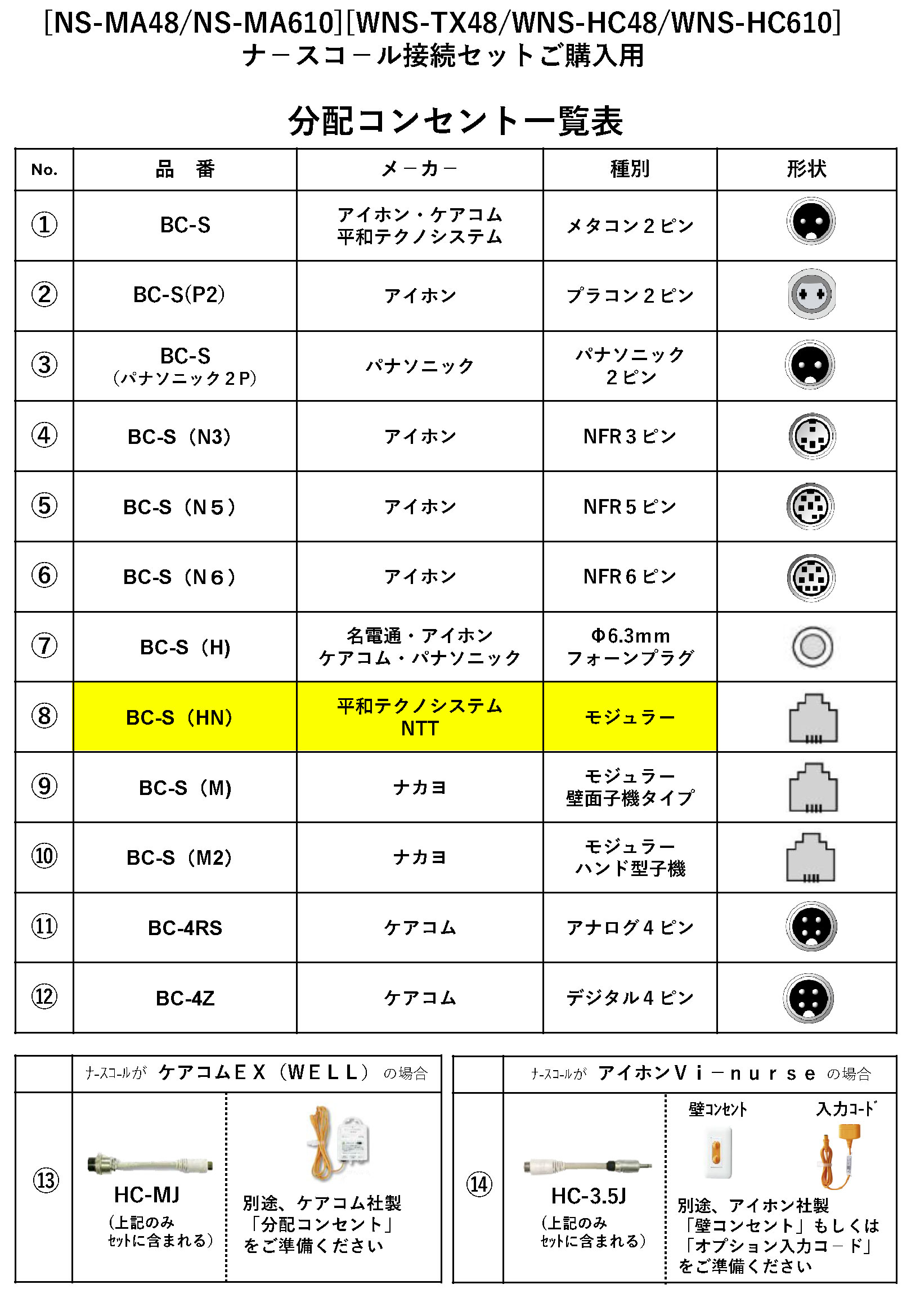 - 分配コンセント:BC-S(HN)(モジュラー仕様、平和テクノシステム・NTTのナースコールに接続)