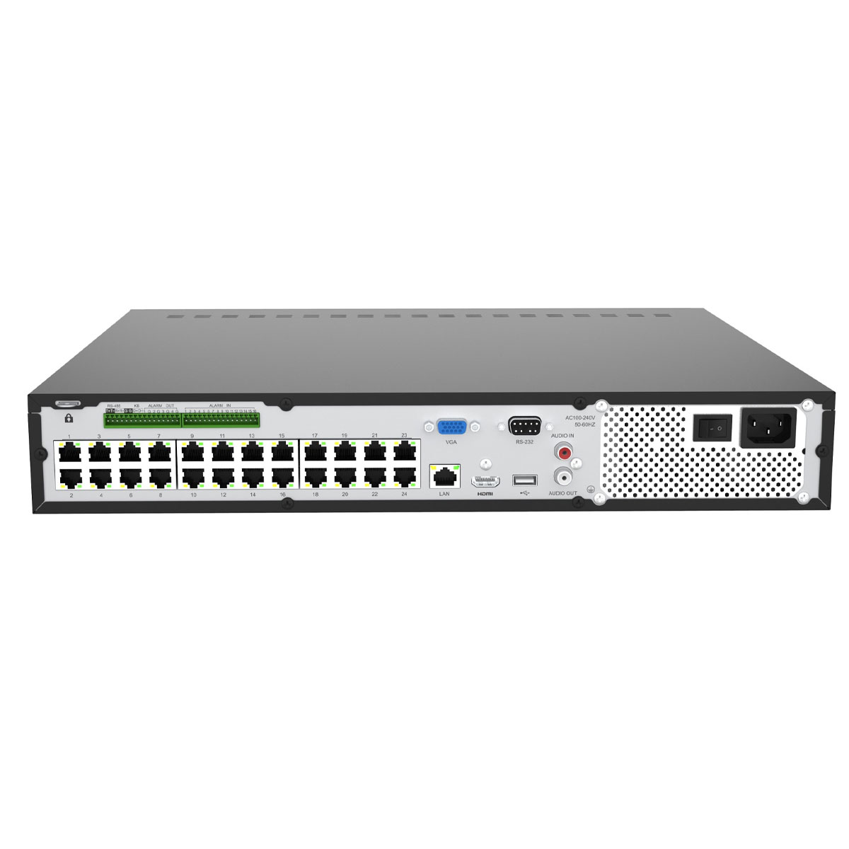 筐体背面に24ポートのPoE給電インターフェースを内蔵し、最大200Wの電源供給が可能。カメラの配線工事を簡略化します。また、POSシステム統合や16/4のアラーム入出力、複数のシリアルポート(RS-485/RS-232)を備え、店舗管理から大規模なセキュリティシステムまで、柔軟なシステム統合を実現します。