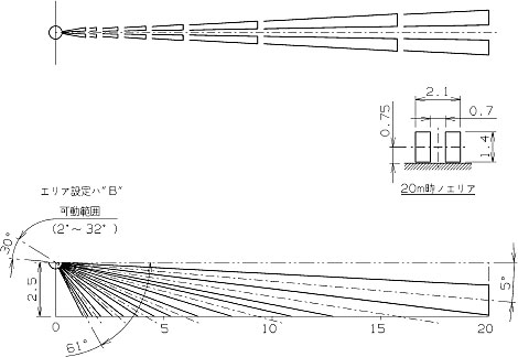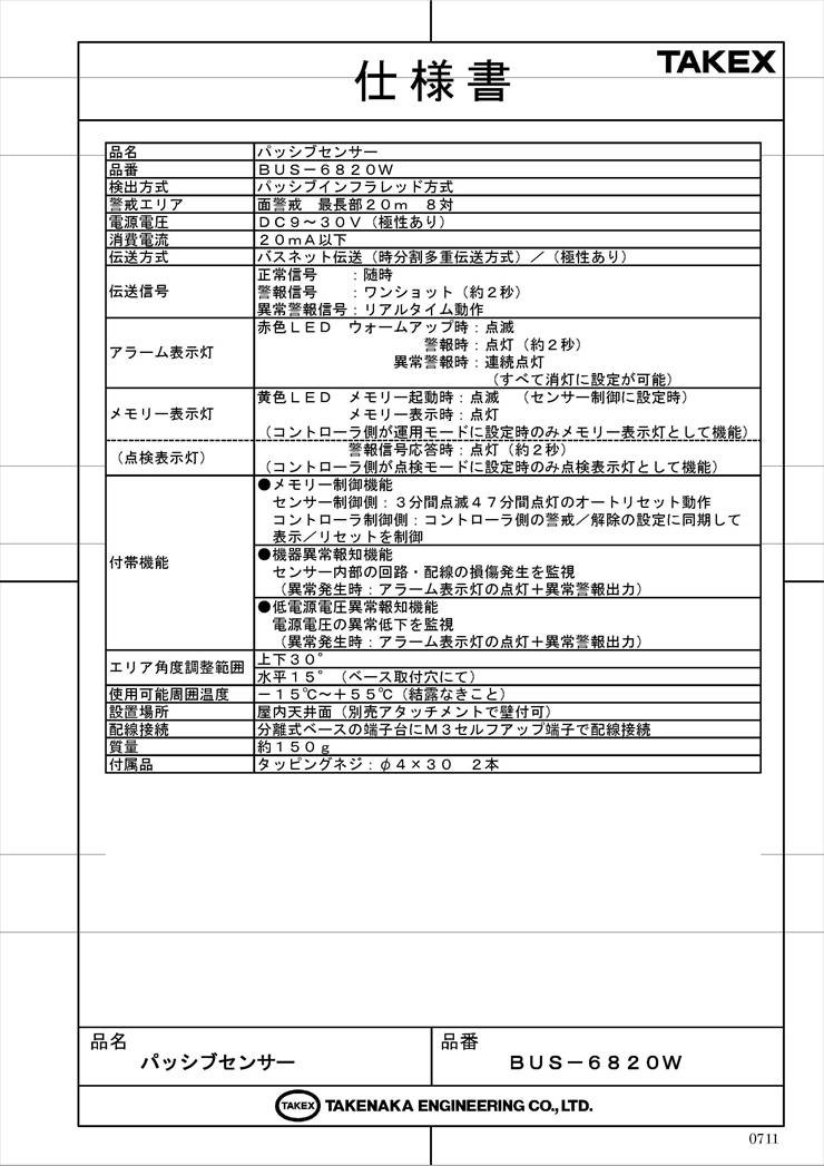 品名 パッシブセンサー 品番 BUS-6820W 検出方式 パッシブインフラレッド方式 (カウント処理) 警戒エリア面 面警戒 最長部20m 8対 電源電圧 DC9〜30V (極性あり) 消費電流 20mA以下 伝送方式 バスネット伝送 (時分割多重伝送方式)/(極性あり) 伝送信号 正常信号 :随時 警報信号 :ワンショット(約2秒) 異常警報信号:リアルタイム動作 アラーム表示灯 赤色LED ウォームアップ時:点滅 警報時:点灯(約2秒) 異常警報時:連続点灯 (すべて消灯に設定が可能) メモリー表示灯 ------------ (点検表示灯) 黄色LED メモリー起動時:点滅 (センサー制御に設定時) メモリー表示時:点灯 (コントローラ側が運用モードに設定時のみメモリー表示灯として機能) ------------------------------------------------------ 警報信号応答時:点灯(約2秒) (コントローラ側が点検モードに設定時のみ点検表示灯として機能)